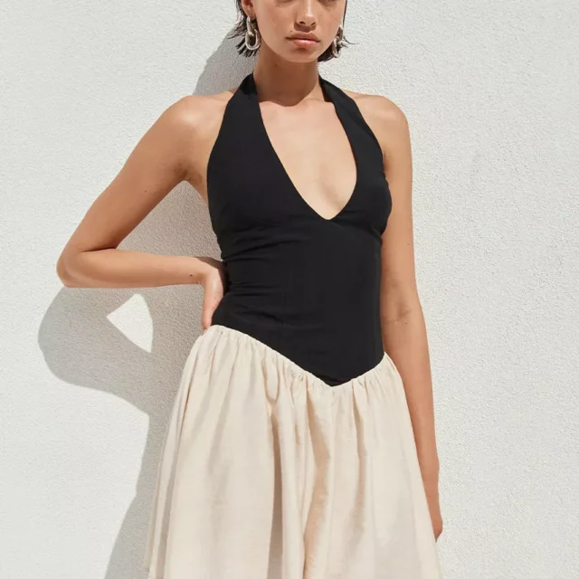 Step into the spotlight and own the room with this stunning Sexy Patchwork V-Neck Mini Dress. Designed for the bold and the fashion-forward, this sleeveless, backless mini dress is the ultimate choice for club nights, parties, and special evenings out. With its eye-catching contrast color design and sultry halter neckline, it’s a dress that promises compliments with every wear. Whether you’re dancing under neon lights or sipping cocktails at a rooftop bar, this dress is made to steal the scene.