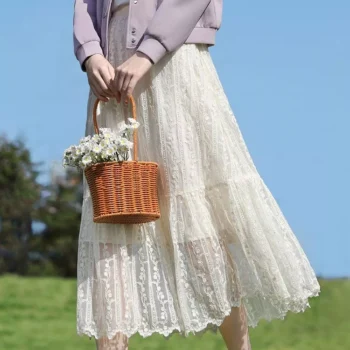 French Apricot Embroidered Lace A-Line Skirt – Spring Mid-Calf Retro Chic