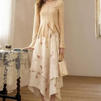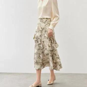 Asymmetric Print Ruffle Midi Skirt with Slit – Elegant A-line Fall Fashion