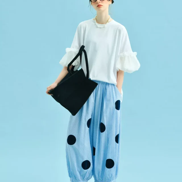 Light as air and charming as a summer breeze, these sky blue wide-leg pants are your new seasonal favorite. Featuring a whimsical mix of blue and white stripes adorned with playful polka dots, these pants are a joyful blend of Japanese simplicity and everyday elegance. Made from soft, breathable pure cotton foam yarn, they offer a dreamy texture that’s perfect for warm weather.