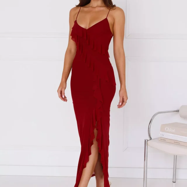 • Elegant Details: Spaghetti straps, ruffle accents, and V-neckline elevate the dress’s sophistication