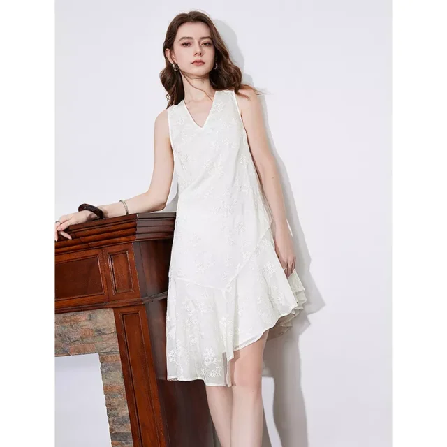 The beauty of this dress lies in its thoughtful design and fine craftsmanship. The combination of a loose waist, A-line silhouette, and intricate embroidery gives this dress a unique, refined look that’s perfect for the modern woman. The irregular hemline provides visual interest, while the sleeveless design makes it ideal for warm-weather wear. Whether you’re dressing for a relaxed weekend or an outdoor event, this dress offers a perfect balance of comfort and style.
