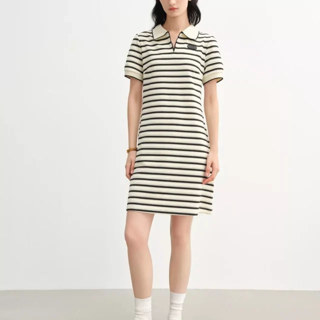 This dress is made for the woman who values both elegance and ease. The collegiate stripes bring a youthful, refined vibe, while the neutral tones make it easy to accessorize. It’s a go-to outfit for mornings when you want to look polished without putting in too much time. Pair it with loafers for a classic academic look or sneakers for a casual spin.