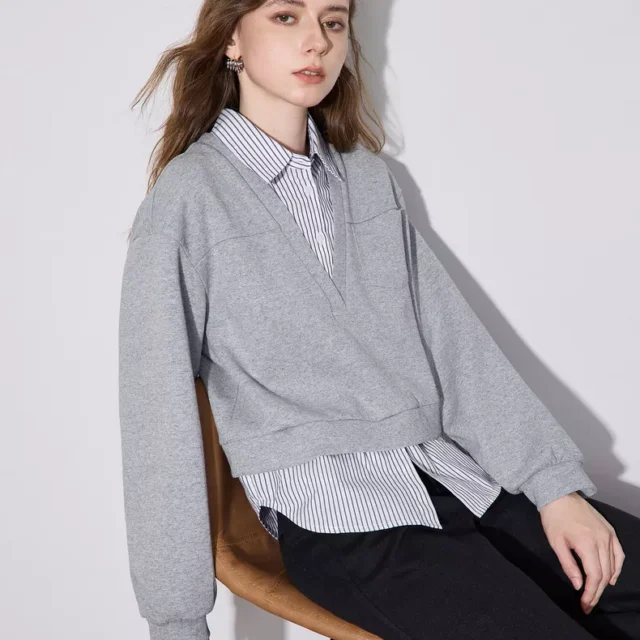 Looking for a winter wardrobe refresh? This sweatshirt is perfect for transitioning seamlessly from workwear to casual outings. The clever patchwork design creates a layered look, saving you the hassle of matching multiple pieces. Its soft cotton material keeps you warm, while the slight stretch ensures you stay comfortable all day long. The turn-down collar adds a sophisticated touch, making this piece a versatile staple for winter.