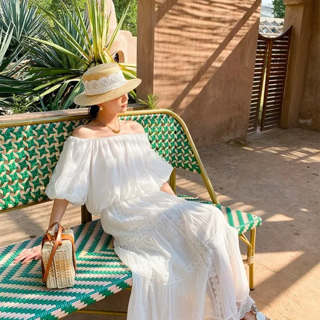 Step into summer with elegance and ease in this stunning 2-piece Boho Holiday Set. Designed for sun-soaked getaways, beach strolls, and relaxed outdoor brunches, this outfit blends a laid-back silhouette with dreamy details. The off-shoulder top with its flirty half-sleeve design adds a touch of allure, while the ankle-length A-line skirt showcases delicate spliced lace embroidery for a feminine, eye-catching finish. Made with a breathable blend of viscose, polyester, and nylon, this outfit is perfect for keeping you cool, confident, and stylish under the summer sun.