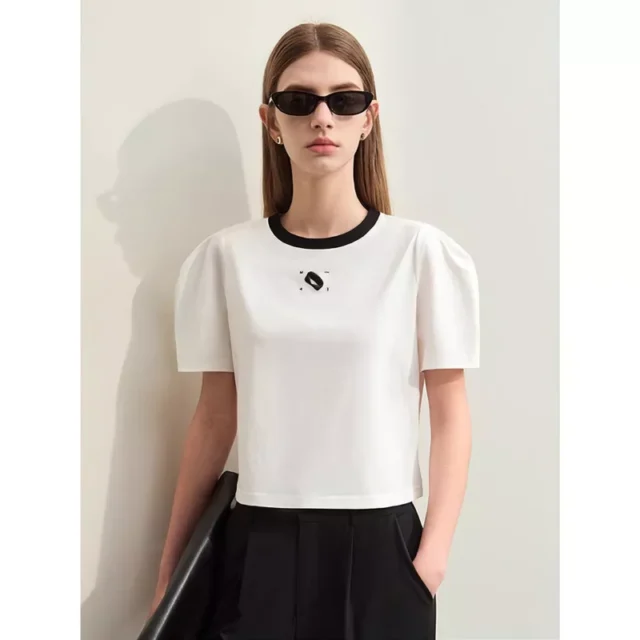 This t-shirt is crafted from a soft blend of cotton and spandex, ensuring both comfort and a flattering fit. The O-neck design provides a timeless look, while the short, leg-of-mutton sleeves offer a unique, fashion-forward touch. With delicate embroidery adding a dash of sophistication, this top is as versatile as it is beautiful.