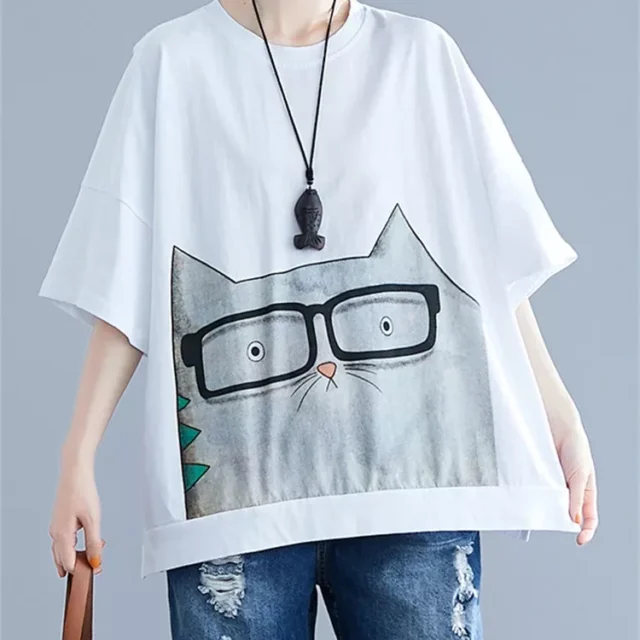 Don’t miss out on the opportunity to elevate your summer wardrobe with our Women’s Cartoon Cat Print T-shirt. Whether you’re a devoted cat enthusiast or simply appreciate cute and quirky fashion, this tee is a must-have addition to your collection. Embrace the laid-back vibes and playful charm of summer fashion with our purr-fect tee!