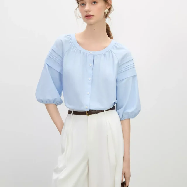 Elevate your summer wardrobe with this beautifully tailored linen-blend short sleeve blouse, designed with a French-inspired charm that never goes out of style. Featuring a soft round neckline and delicately puffed lantern sleeves, this blouse brings a graceful yet modern silhouette to your everyday look. The slim fit flatters your shape without clinging, while the lightweight fabric offers breathability and comfort even on the hottest days.
