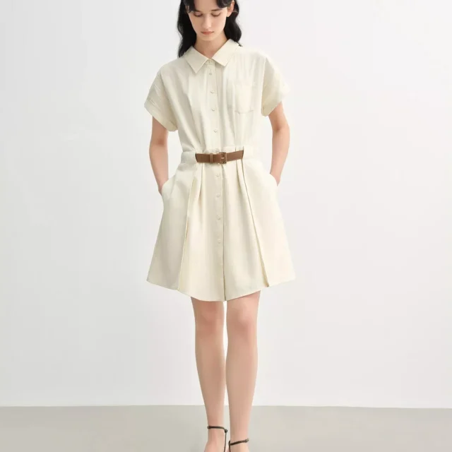 Meet your new summer wardrobe essential – this breathable linen-blend shirt dress combines polished tailoring with all-day comfort. The empire waist accentuates your smallest point while the A-line silhouette gracefully skims your curves. With its classic collar and midi length, this dress transitions seamlessly from brunch dates to office days with just a change of accessories.