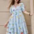 Summer New Arrivals Fruit Print Blue And White Checkered Bubble Sleeve Chic Dress For Women