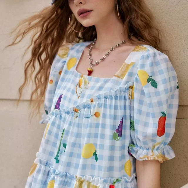 Turn heads with this adorably chic summer dress that blends classic blue-and-white gingham with juicy fruit prints for a look that’s sweet without being childish. The bubble sleeves add a trendy puff of personality, while the square neckline keeps it effortlessly elegant—perfect for everything from brunch dates to weekend adventures.