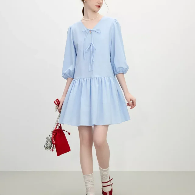 Made from a premium cotton-linen blend, the fabric feels soft, airy, and naturally cooling — ideal for sunny days and breezy evenings. Its minimalist design, featuring a chic V-neck and delicate bow accent, makes this dress both professional enough for the office and relaxed enough for a weekend brunch or vacation stroll. Mid-calf length and short sleeves give it a refined balance between modesty and style.