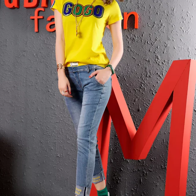 With its bold yellow hue and shimmering sequin “GOGO” lettering, this top doesn’t just follow trends—it sets them. The subtle striped tape detail on the shoulders brings in a sporty edge, while the classic round neckline and regular short sleeves offer a universally flattering silhouette. This T-shirt is all about balance: comfort and fashion, classic design with a modern twist.