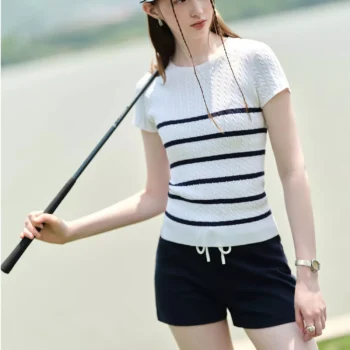 Women’s Striped Knit Short-Sleeve Sweater with Back Cut-Out – Summer Pullover