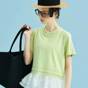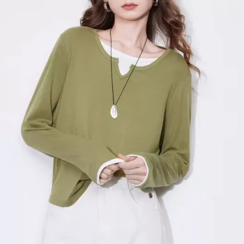 Women’s Color Blocking Splicing Fake Two Piece Slim Fit Long Sleeve T-shirt