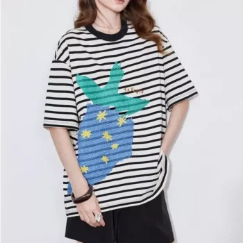 Striped Strawberry Embroidered Round Neck Short Sleeve T-shirt