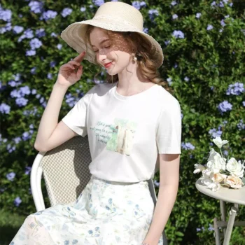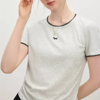Gray Embroidered Puppy Tee – Contrast Color, Casual Summer Short Sleeve