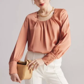Women’s Chic Silk Blouse – Square Collar Solid Top with Shirring