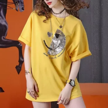 Summer Yellow Oversized Cotton T-Shirt with Sequin Smiley Face