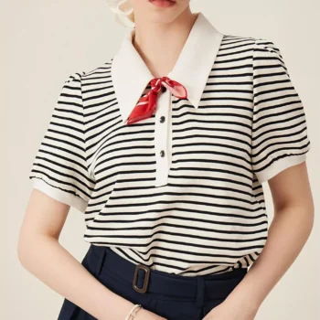 Summer Striped Polo-Neck Tee with Puff Sleeves