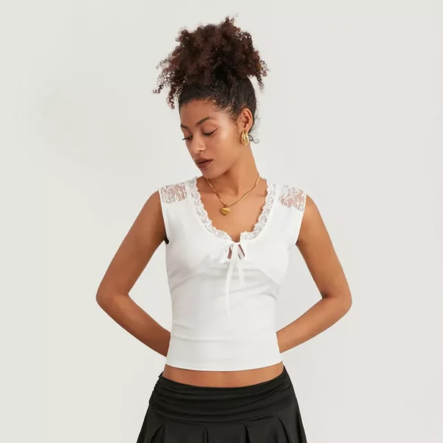 Elevate your summer fashion game with our stunning Lace Trim Crop Tank Tops. Crafted to perfection, these sleeveless tops boast a charming V-neckline and a front tie-up detail that adds a touch of flirtatious flair to your ensemble. The intricate lace patchwork accentuates the feminine appeal, making it a must-have for fashion-forward ladies.