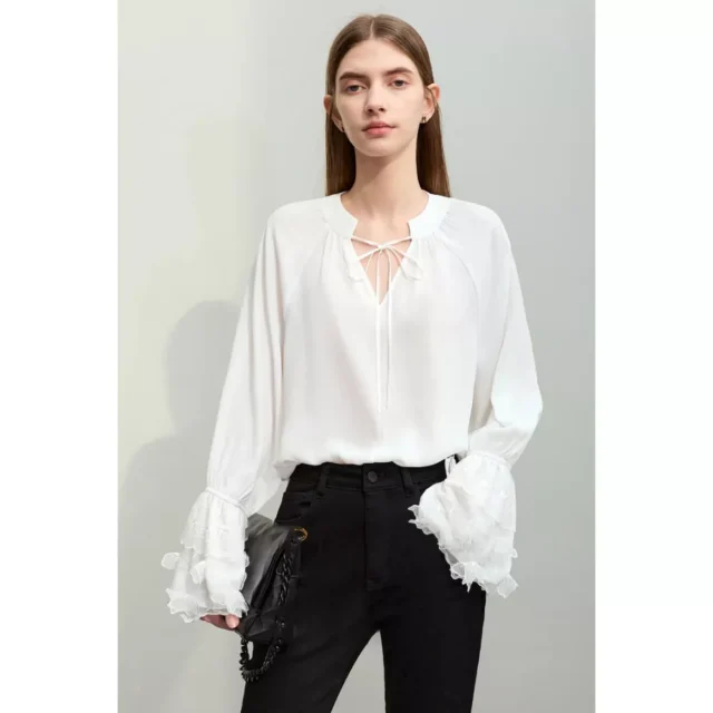 Embrace the new season with our latest arrival, the V-Neck Lace Chiffon Blouse, perfect for adding a touch of fairy style elegance to your wardrobe. Crafted from premium chiffon, this mid-length blouse is designed to flatter with its loose fit and ethereal flare sleeves. Whether you’re updating your office look or seeking a chic, casual ensemble, this blouse is your go-to for spring 2024.