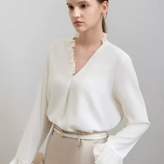 • Ruffle Splicing Detail: Adds a stylish and modern twist to the classic blouse, elevating the overall design.