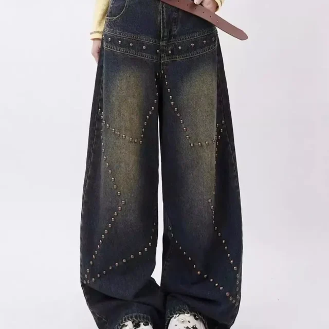 Vintage Distressed Wide-Leg Jeans with Rivet Accents