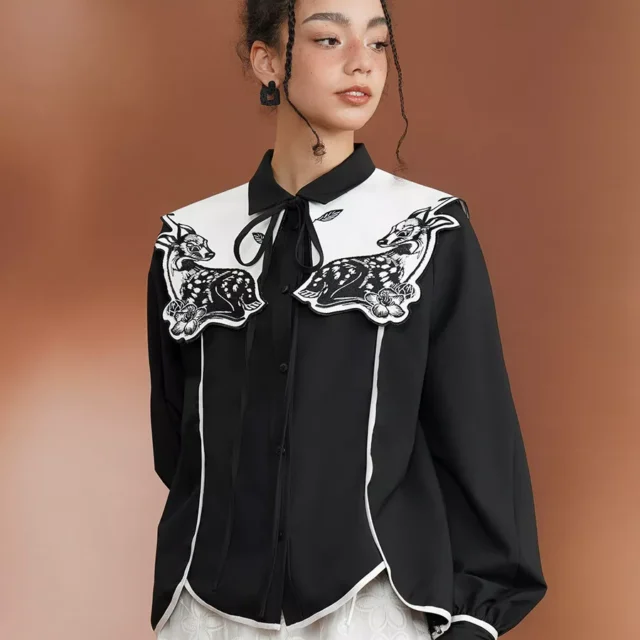 Vintage Fawn Embroidered Black Blouse with Detachable Collar for Women