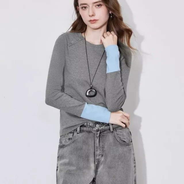 Refresh your wardrobe with this stunning contrast patchwork long-sleeve T-shirt, designed to bring effortless style and comfort to your everyday look. Crafted for women who love a modern yet sophisticated touch, this top blends soft cotton fabric with a sleek, body-hugging fit that flatters your silhouette. The patchwork design adds a unique, eye-catching detail, making it a perfect statement piece for any casual or office-chic outfit.
