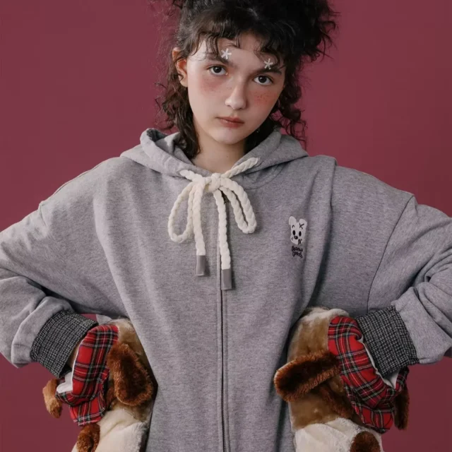 Unlike ordinary jackets, this plush-lined hoodie offers both warmth and fashion-forward style. The soft jersey fabric combined with the warm fleece interior ensures comfort without the bulk. Plus, the embroidered details and loose fit make it a trendy yet functional piece for any wardrobe.