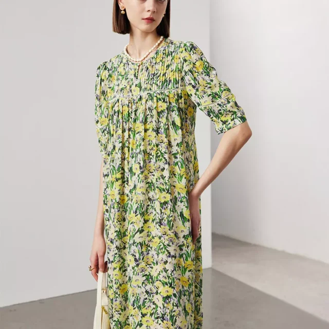 This floral silk dress stands out for its luxurious fabric and timeless design. Its A-line silhouette and O-neck make it both flattering and comfortable, whether you’re strolling through a park or attending a casual event. The loose waistline gives the dress a relaxed, breezy feel, making it ideal for warm spring and summer days. The floral print in yellow-green adds a refreshing burst of color, evoking the beauty of blooming gardens and sunny afternoons.