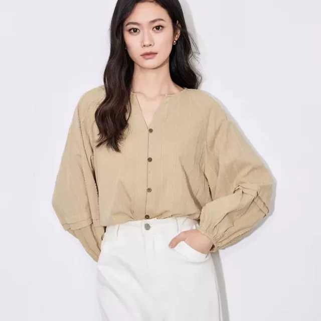 What sets this blouse apart is the delicate balance it strikes between casual and refined. The classic V-neck, along with the soft cotton fabric, offers both comfort and style, while the jacquard pattern gives it a unique, textured appeal. The lantern sleeves add a trendy twist, making it the perfect statement piece for any wardrobe. Whether you’re dressing up for a work event or down for a casual day, this blouse can be easily styled to suit your mood and occasion.