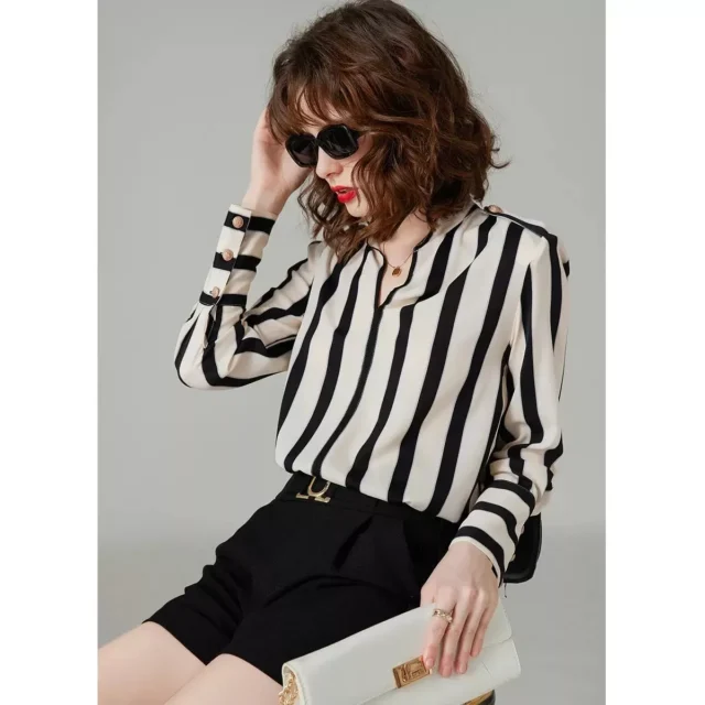This V-neck striped blouse is a must-have for your autumn wardrobe. Whether you’re looking for an everyday office staple or something special for those cooler months, this top checks all the boxes. Don’t miss out on the opportunity to upgrade your look with this stylish and versatile piece. Add it to your cart now and step into the season with confidence!