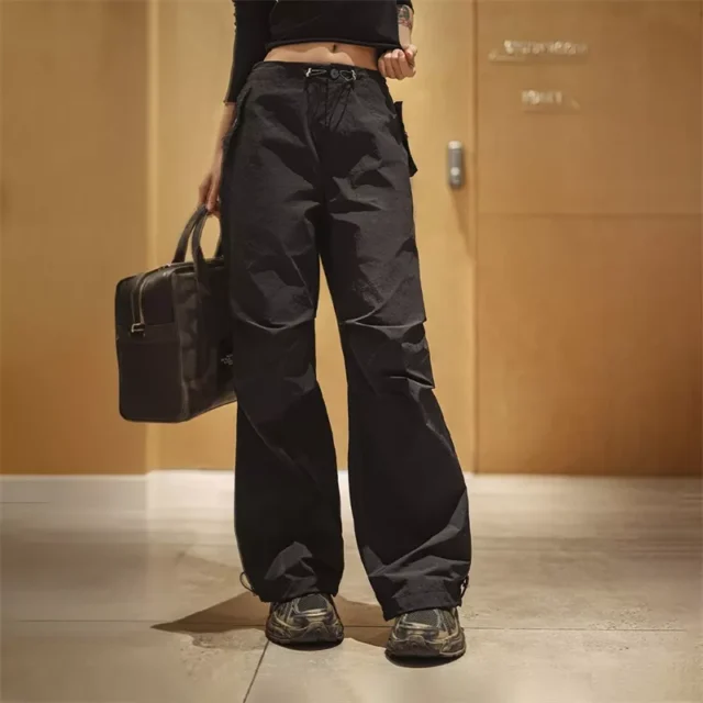 Women’s Pleated Black Wide-Leg Parachute Pants with Drawstring – Spring & Summer