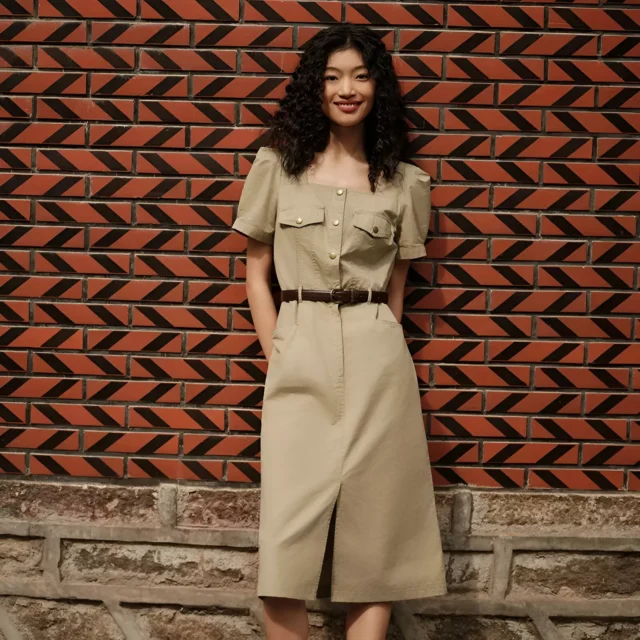 The dress’s utility-inspired details, including functional pockets and a single-breasted closure, add a modern twist to its vintage aesthetic. Its natural waistline and regular fit ensure a comfortable yet stylish shape that works for all body types. Whether you’re heading to brunch, running errands, or enjoying a casual summer evening, this dress is your go-to for effortless sophistication.