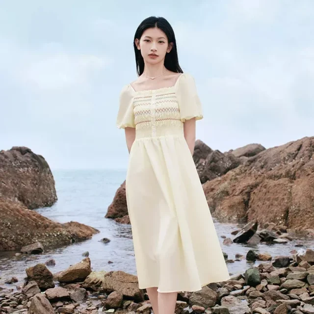 Step into spring with this stunning mid-length dress that combines playful charm with graceful elegance. The square neckline and bubble sleeves make this dress an absolute standout, offering both a touch of vintage sophistication and a modern, carefree vibe. Perfect for any casual outing, this dress is designed to keep you comfortable and stylish during those warmer months.