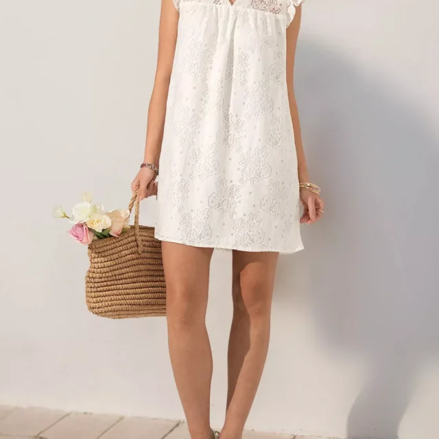 Whether you’re heading to a brunch with friends, a sunny day at the market, or a relaxed evening stroll, this dress is the perfect go-to. Made from lightweight polyester with slight stretch, it feels soft against the skin and moves gracefully with every step. The sleeveless tank style and V-neckline create a breezy, flattering shape, while the delicate lace detailing adds just the right touch of femininity.
