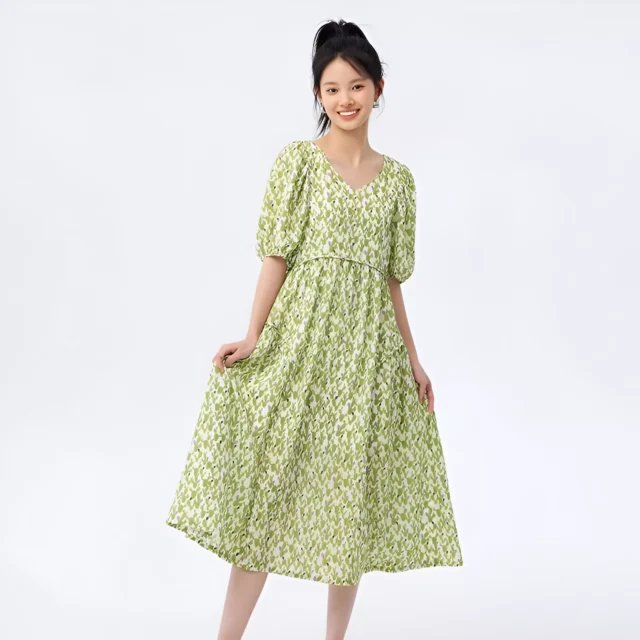 Step into a world of soft femininity with this stunning V-neck slim fit chiffon dress. Designed for women who love an elegant yet laid-back look, this dress combines the lightness of chiffon with a flattering A-line silhouette. The delicate puff sleeves add a hint of romance, while the textured print brings a sense of understated beauty. Perfect for casual outings, dates, or even garden parties, this dress will make you feel effortlessly graceful and confident.