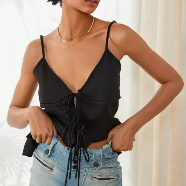 Embrace the summer vibes and add a touch of sultry style to your wardrobe with our Women’s V-Neck Tie-Up Camisole. This sleeveless vest top, designed for the fashion-forward woman, is perfect for club nights or casual outings on warm summer evenings. Its solid color and chic tie-up front ensure you stand out in simplicity and style.